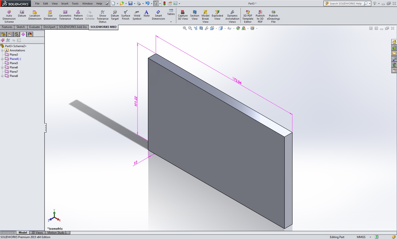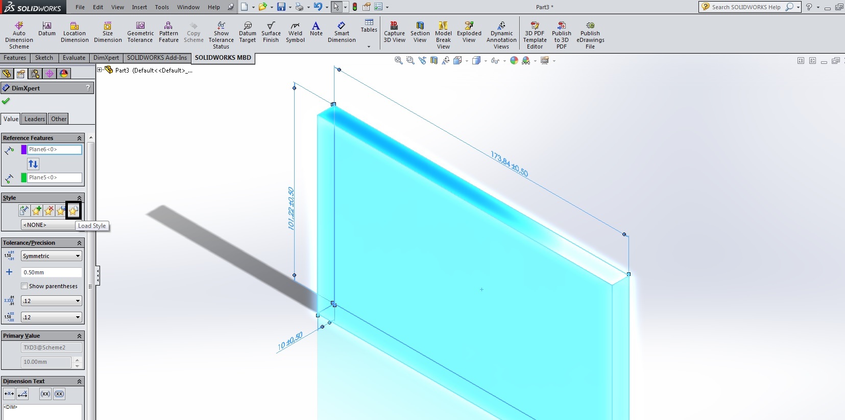 Sedaj v SOLIDWORKS-u izberemo vse dimenzije dodane z DimXpert-om in naložimo shranjeni stil.