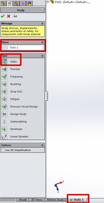 Osnovna analiza v SOLIDWORKS Simulation paketu je statična-linearna analiza. Da začnemo takšno analizo definirati, moramo najprej vklučiti modul simulacij v SOLIDWORKS-u. To storimo na "Tools -> Add-Ins...". S tem se nam bo na našem Comand Manager-ju prikazal zavihek za simulacije. Na tem zavihku kliknemo na puščico pod ukazom "Study Advisor" in izberemo ukaz "New Study".