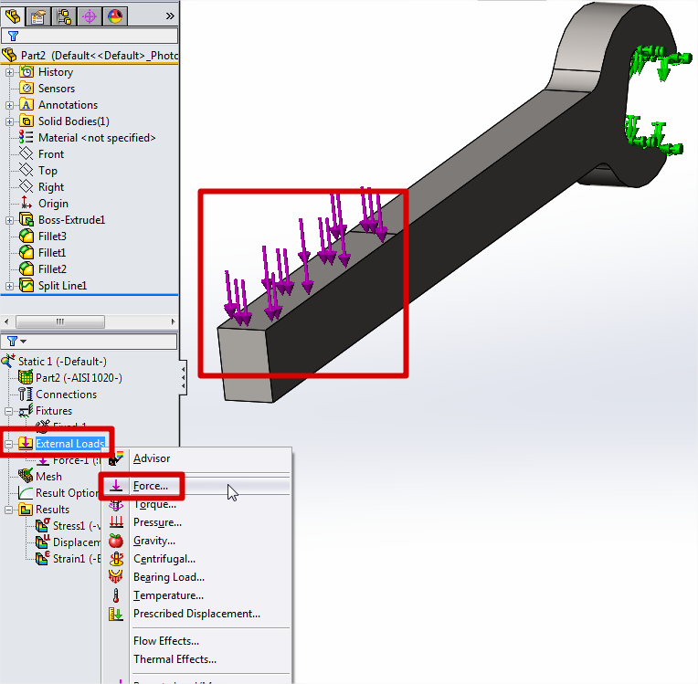 Sedaj pa je potrebno dodati še silo na ročko. To naredimo z desnim klikom na "External Loads" in izbiro ukaza "Force". V ukazu nato definiramo kje bo sila delovala (na spodnji sliki je to površina z vijoličnimi pušicami) in kolikšna bo le-ta.