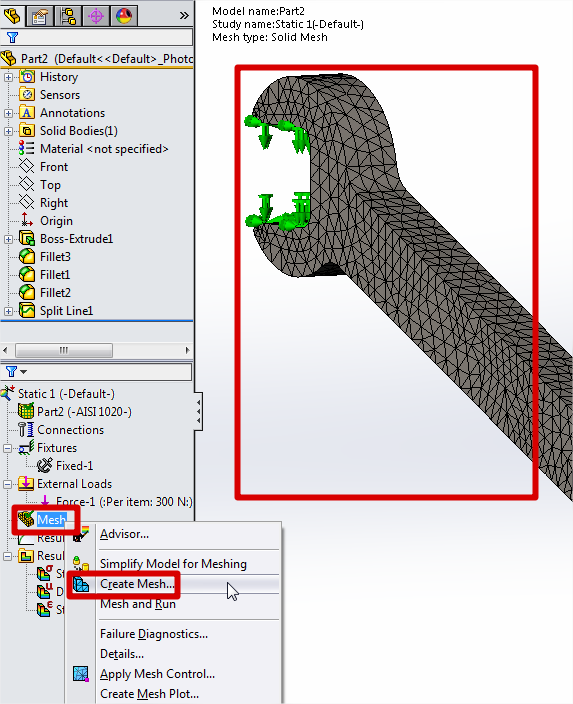 Sedaj je potrebno le še zamrežiti in pognati analizo. Model se zamreži z desnim klikom na "Mesh" in izbiro "Create Mesh". V ukazu za mreženje lahko spreminjamo parametre mreže. Ko potrdimo ukaz, se model zmreži (razbije na manjše dele).