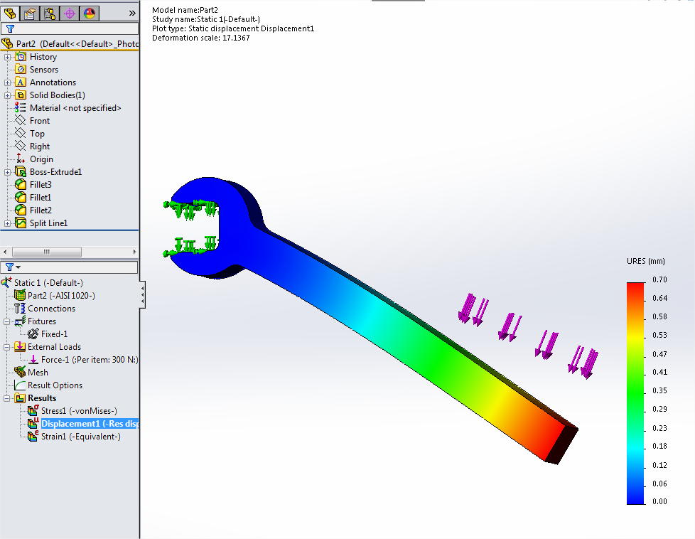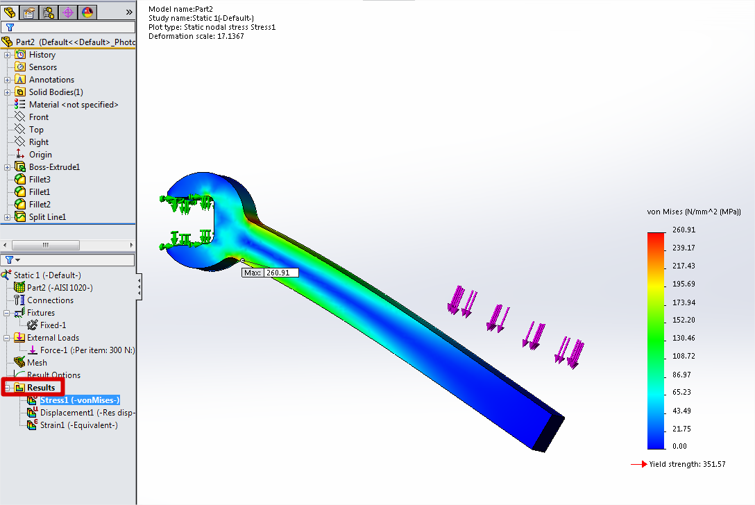 Ko se analiza preračuna, dobimo v mapi "Results" tri različne predpripravljene poglede rezultata. Prvi je "Von Mises napetost v materialu", drugi je "Premik iz nevtralne lege" in zadnji je "Specifična deformacija". Če želimo videti posamezen rezultat, ga v mapi results izberemo z dvoklikom.