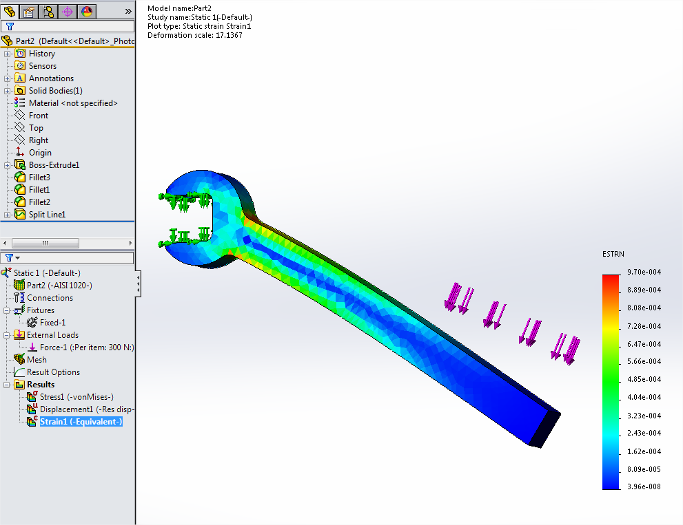 V našem primeru bomo analizirali obnašanje ključa, ko ga obremenimo s 300N. Ko izberemo zavihek z imenom naše analize, se nam pod SOLIDWORKS drevesno strukturo prikažejo nastavitve analize. Prva stvar, ki jo je potrebno definirati je material našega kosa. V primeru, da je bil material definiran že na samem SOLIDWORKS kosu, se materialni podatki samodejno prenesejo v analizo. Material definiramo tako, da z desnim klikom izberemo telo v drevesni strukturi simulacije in izberemo "Apply/Edit Material...".