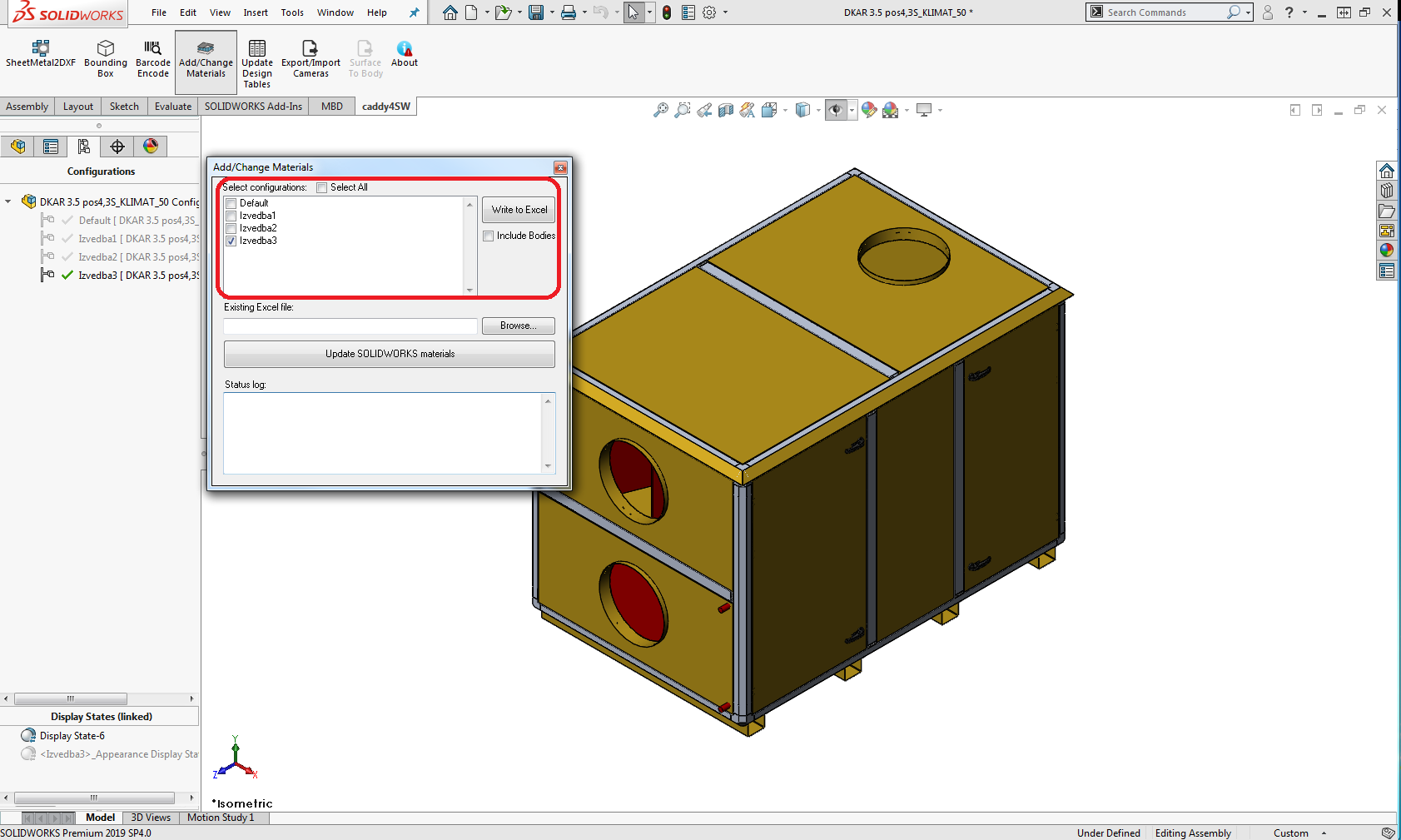Dodamo ali zamenjamo lahko material s katerim koli materialom, ki ga imamo definiranega v SOLIDWORKS knjižnici. Urejanje izvedemo v excelu.