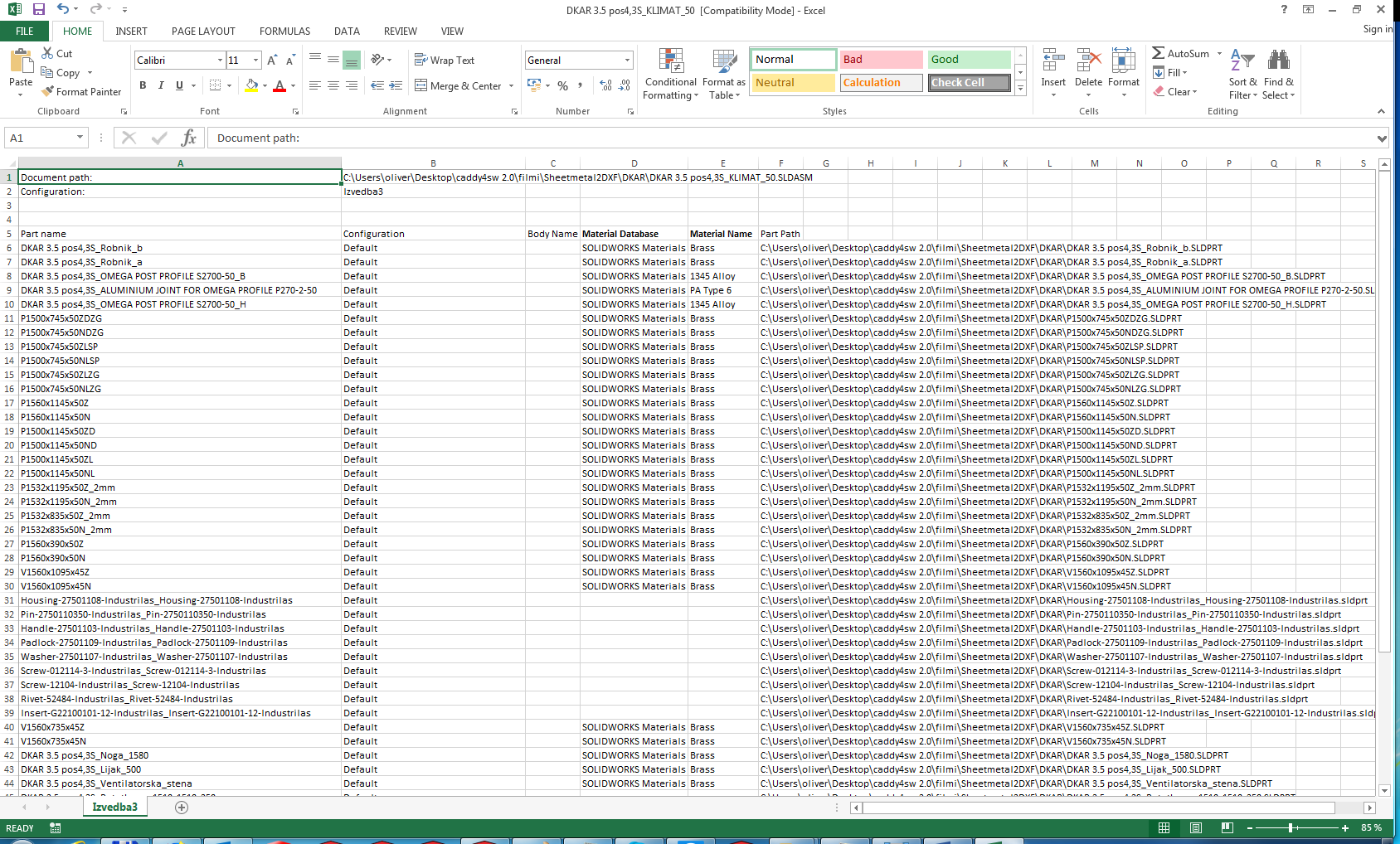 - V excelu se nam po izvozu zapišejo pod parametre »Material Database« in »Material Name« vrednosti materiala katere smo določili v SOLIDWORKS-u. V primeru, da nimamo predhodno določenega materiala so celice prazne.
