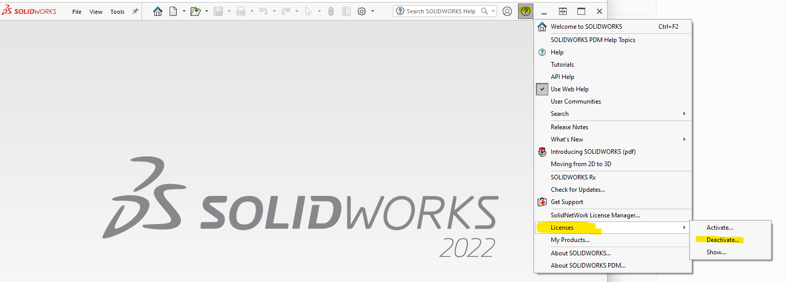 - V programu SOLIDWORKS v menijski vrstici kliknemo "?", v meniju, ki se odpre pa "Licenses" -> "Deactivate" (v starejših verzijah SOLIDWORKS-a se je ukaz imenoval "Transfer licenses")