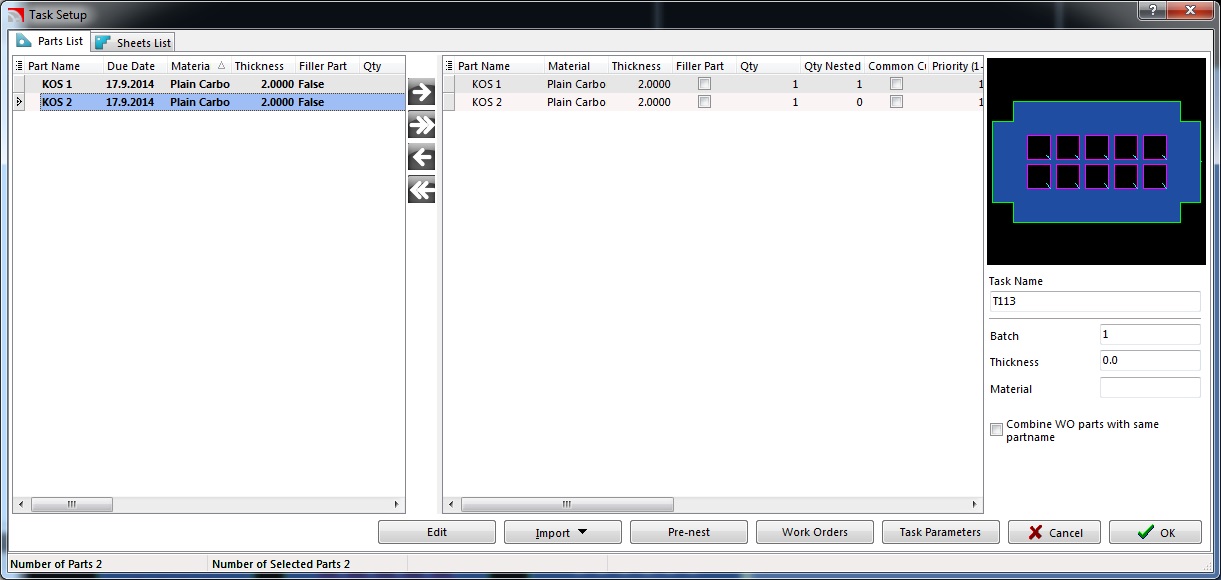 V oknu Task Setup pod zavihek Parts List na levi strani označimo naš novi kos "KOS 2" in ga s puščico dodamo na desno stran, kjer ga vključimo v obstoječo nalogo.