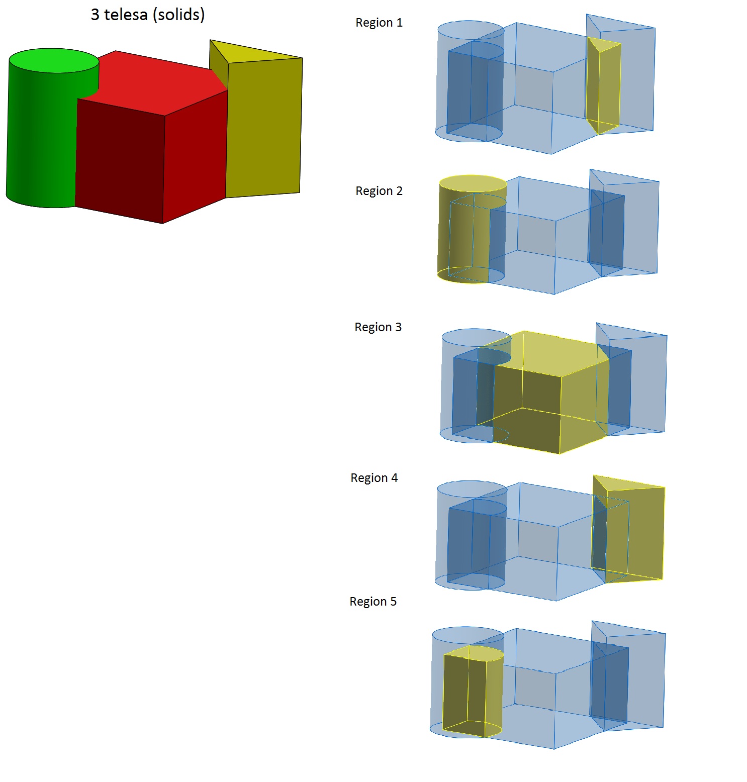 a) Izberemo več teles, ki se med sabo sekajo, nato kliknemo ukaz "Intersect". Funkcija nam našteje različne regije (označene v rumeno), katere lahko izločimo kot na sliki: