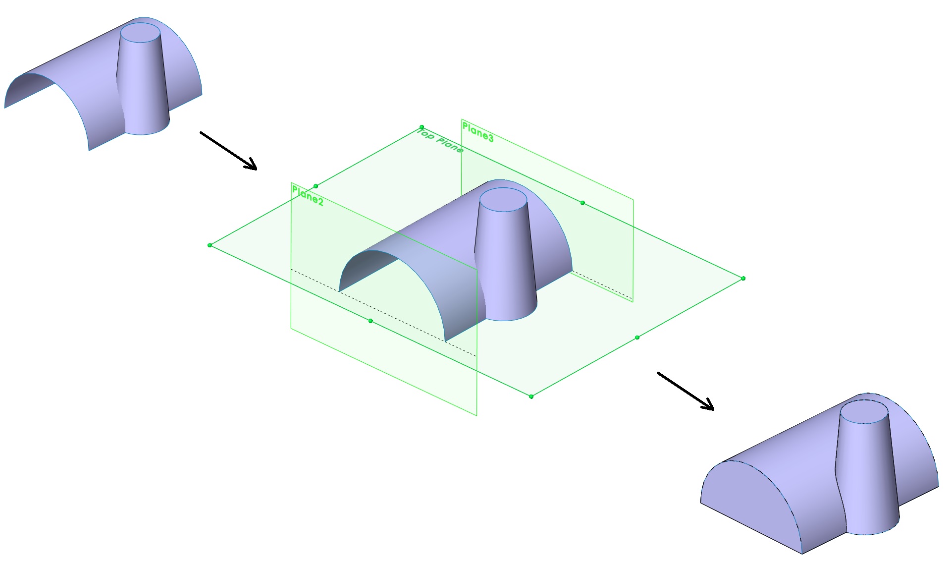 b) Izdelamo telesa iz odprte površinske geometrije (z uporabo referenčnih ravnin), kot na sliki: