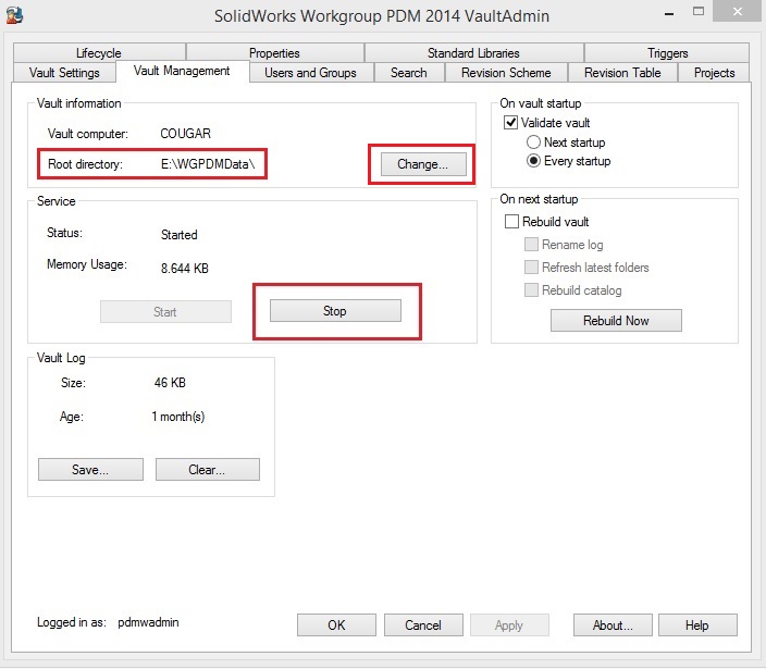 SOLIDWORKS Workgroup PDM VaultAdmin zaženemo kot administrator -> zavihek Vault Management -> razdelek Service, klik na Stop