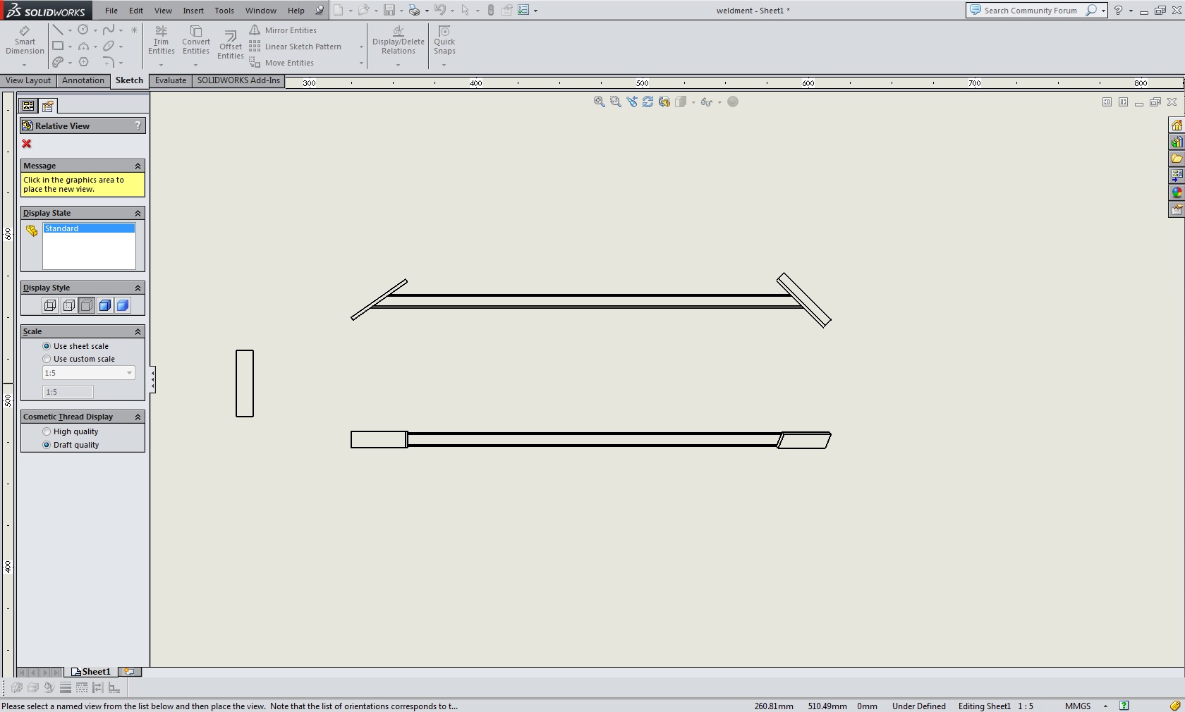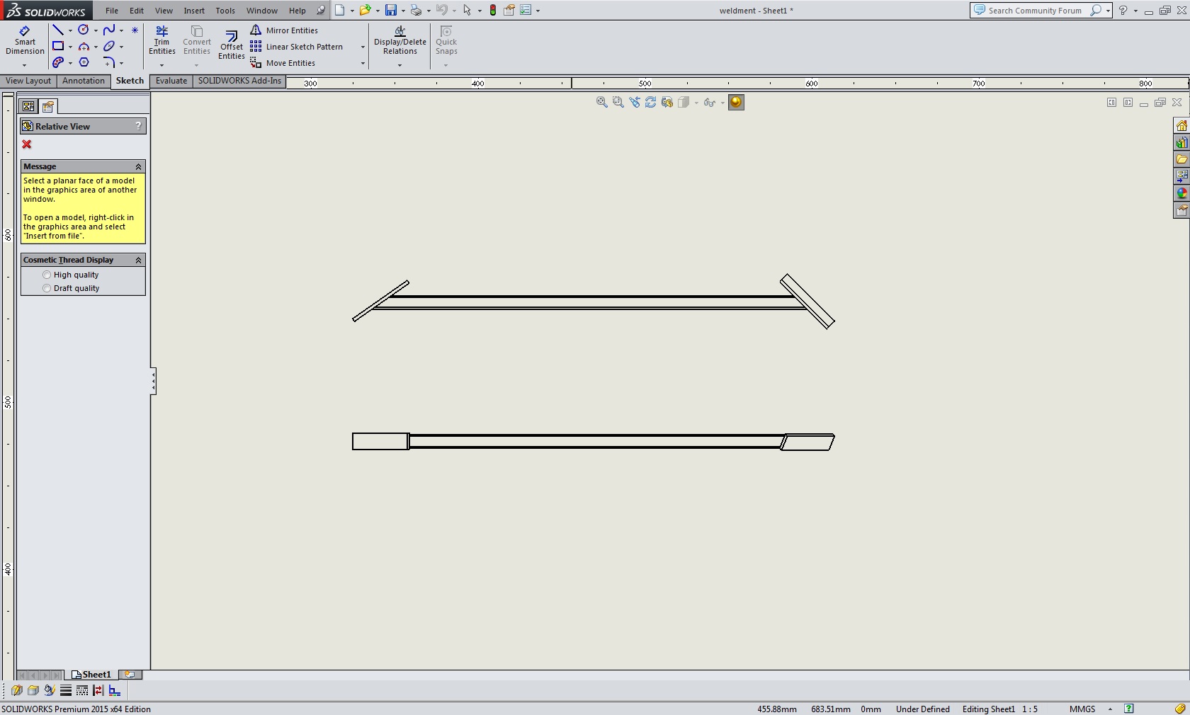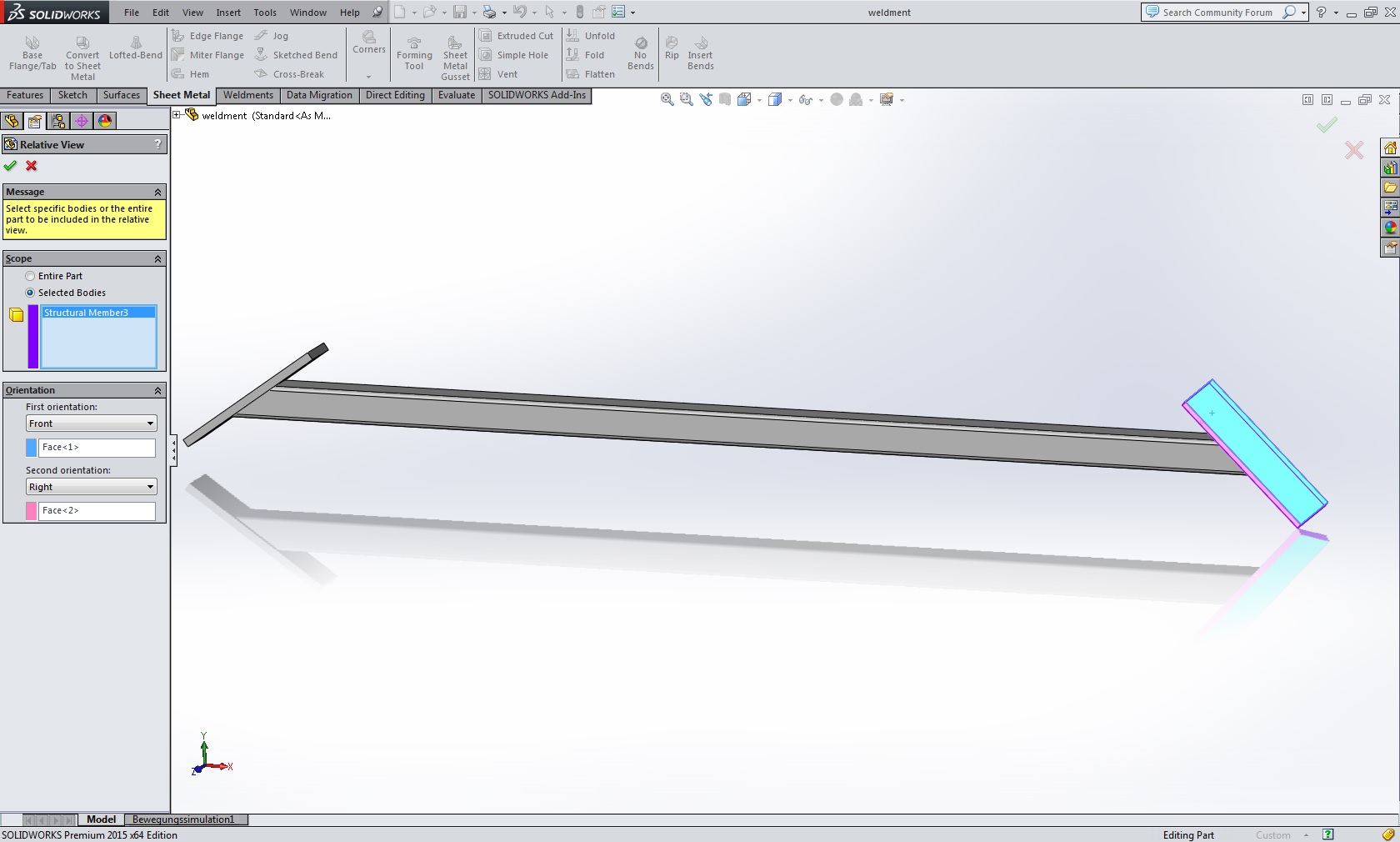 - Zaženemo Relative To Model funkcijo - Na risbi izberemo pogled varjene konstrukcije in se nam prikaže kos