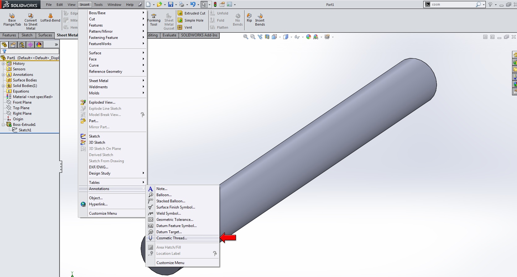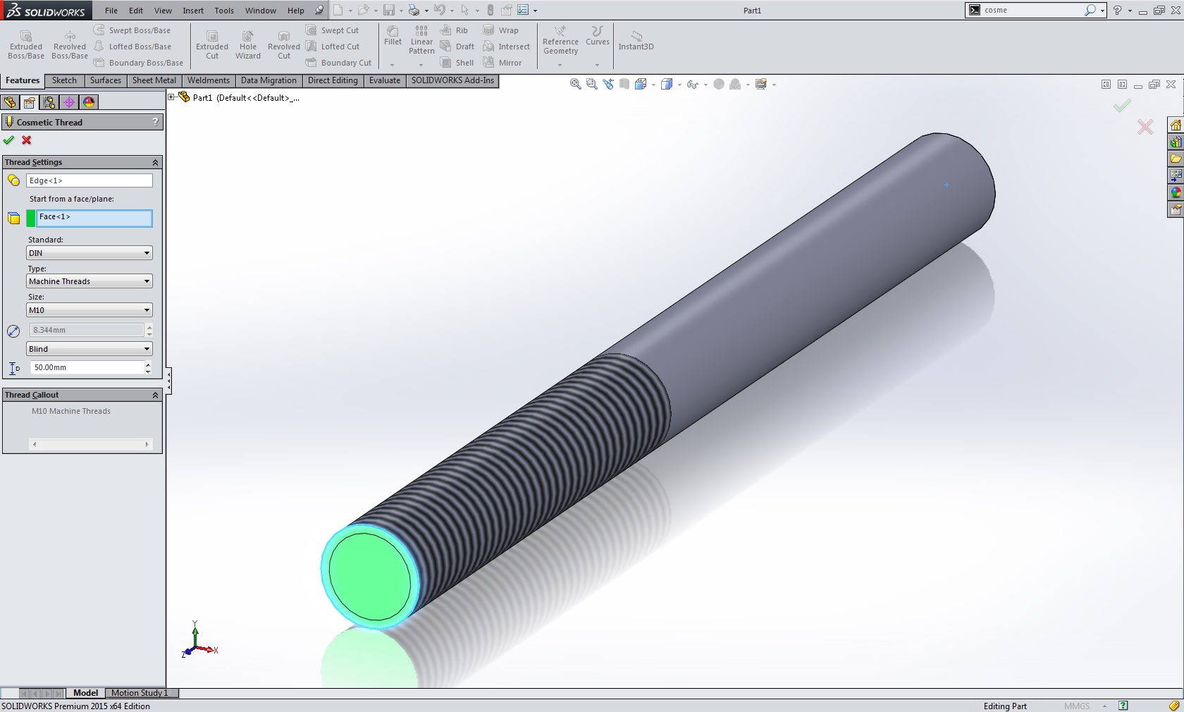 Da definiramo navoj na palici moramo uporabiti funkcijo Cosmetic Thread (Insert->Annotation->Cosmetic thread)