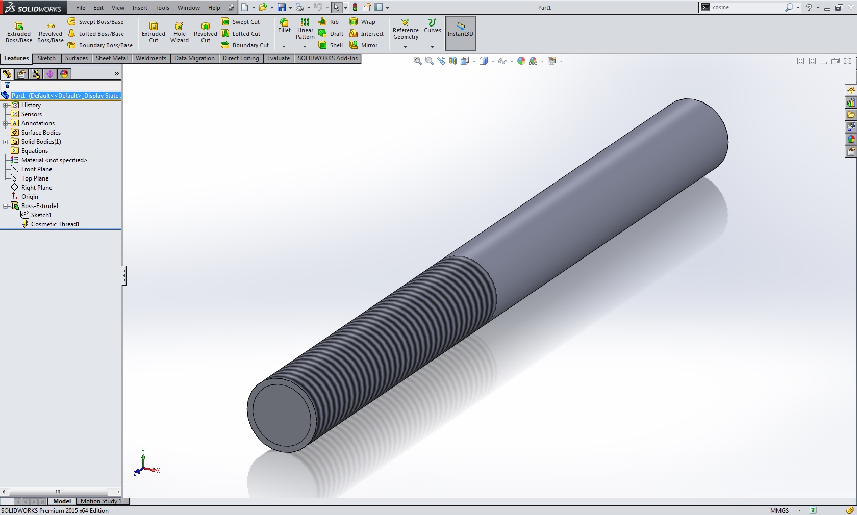 Ko potrdimo Comsetic thread funkcijo v geometrijskem oknu vidimo na palici novi rob ki nam predstavlja navoj, pod gradnik Extrude pa vidimo novi dodani gradnik Cosmetic thread s katerim smo definirali navoj.