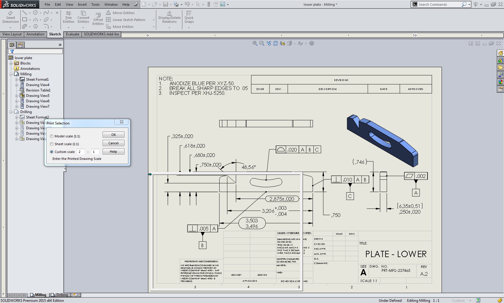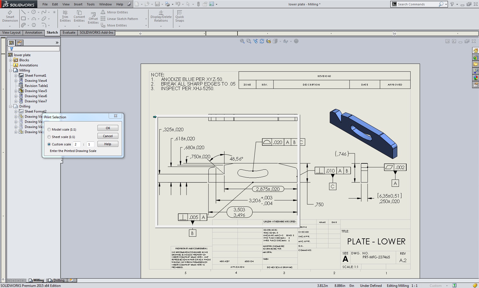 V oknu Print poleg Current screen image izberemo še Selection. Potrdimo okno Print in sem nam prikaže okno Print selection. V oknu Print selection lahko nastavimo skalo s katero določimo velikost okna tiskanja v grafičnem polju. Če želimo spremeniti skalo na poljubno velikost okna tiskanja lahko izberemo Custom scale in vpišemo željeno skalo ter potrdimo spremembo z Apply scale. Da premaknemo okno tiskanja z miško primemo okvir okna in premaknemo na željno pozicijo na risbi. Potrdimo okno Print selection in začnemo tiskati.