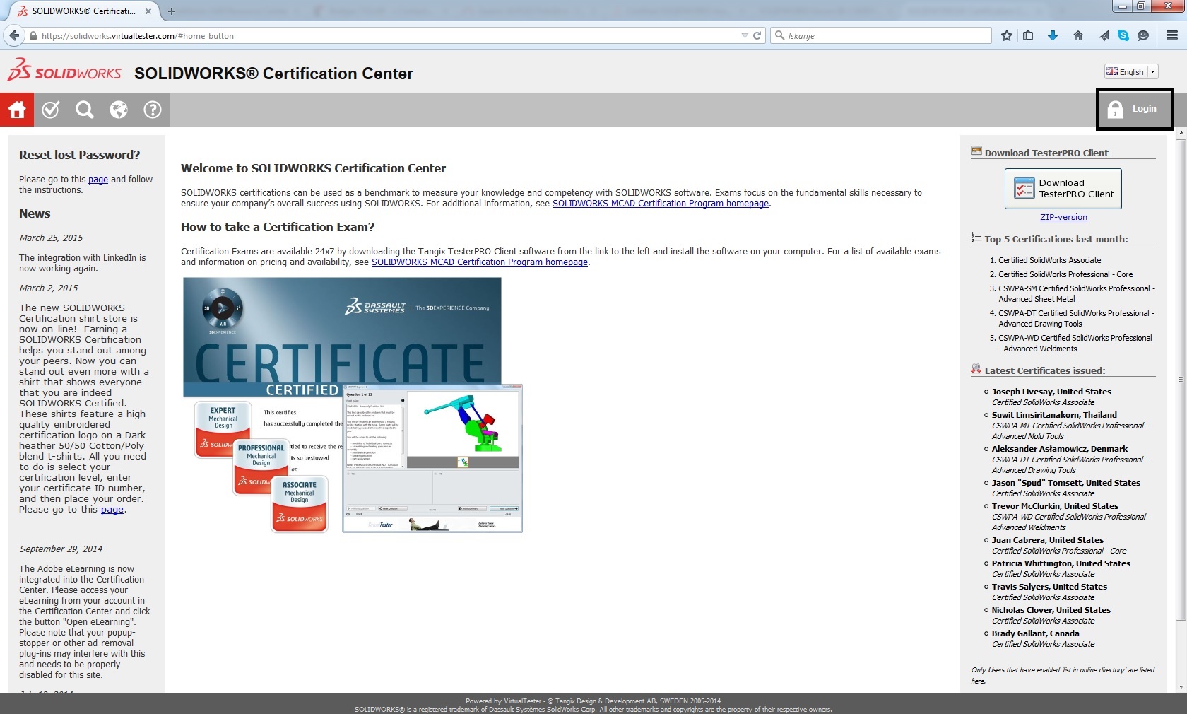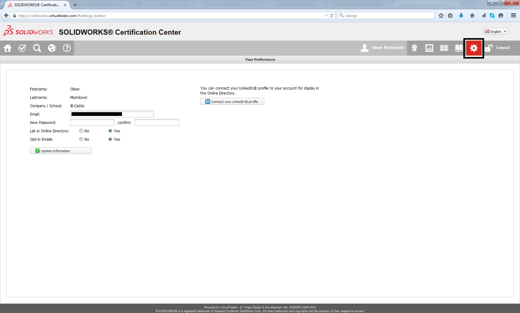 - Na internetnoj stranici SOLIDWORKS® Certification Center (https://solidworks.virtualtester.com/) se prijavite sa klikom na Login u desnom gornjem uglu. Upišite vaše korisničko ime i lozinku sa kojim ste se prijavili preko aplikacije TesterPRO Client. - Nakon prijave na internetnoj stranici kliknite na ikonu Settings u desnom gornjem uglu i ponovo radi bezbednosti vpišiti vašu lozinku. - Sada pod podešavanjem uključite opciju "List in Online Directory"