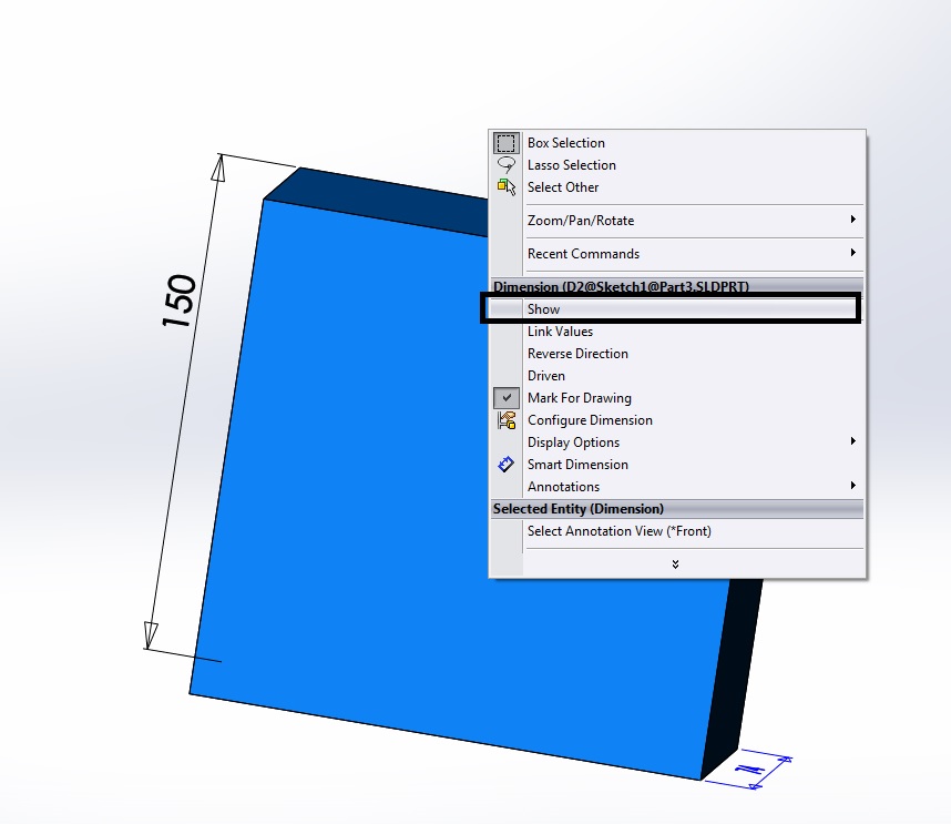 2. Desni klik na dimenzijo katero želiti ponovno prikazati in izberite Show S tem je ponovno prikazana skrita dimenzija.