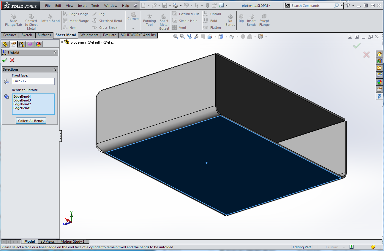 V ukazu "Unfold" moramo najprej izbrati nepremično (fiksno) površino in nato poklikati zvite robove, za katere želimo, da se razvijejo. Imamo tudi gumb "Collect all bends" za izbiro vseh robov. S tem ukazom se pločevina razvije.