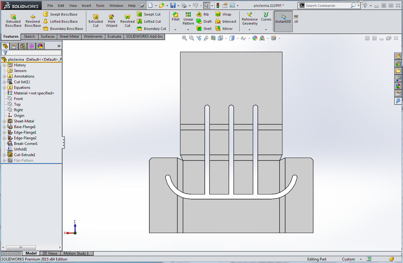 Če želimo na razviti pločevini karkoli narediti, moramo najprej model naše pločevine razviti. To naredimo s funkcijo "Unfold".