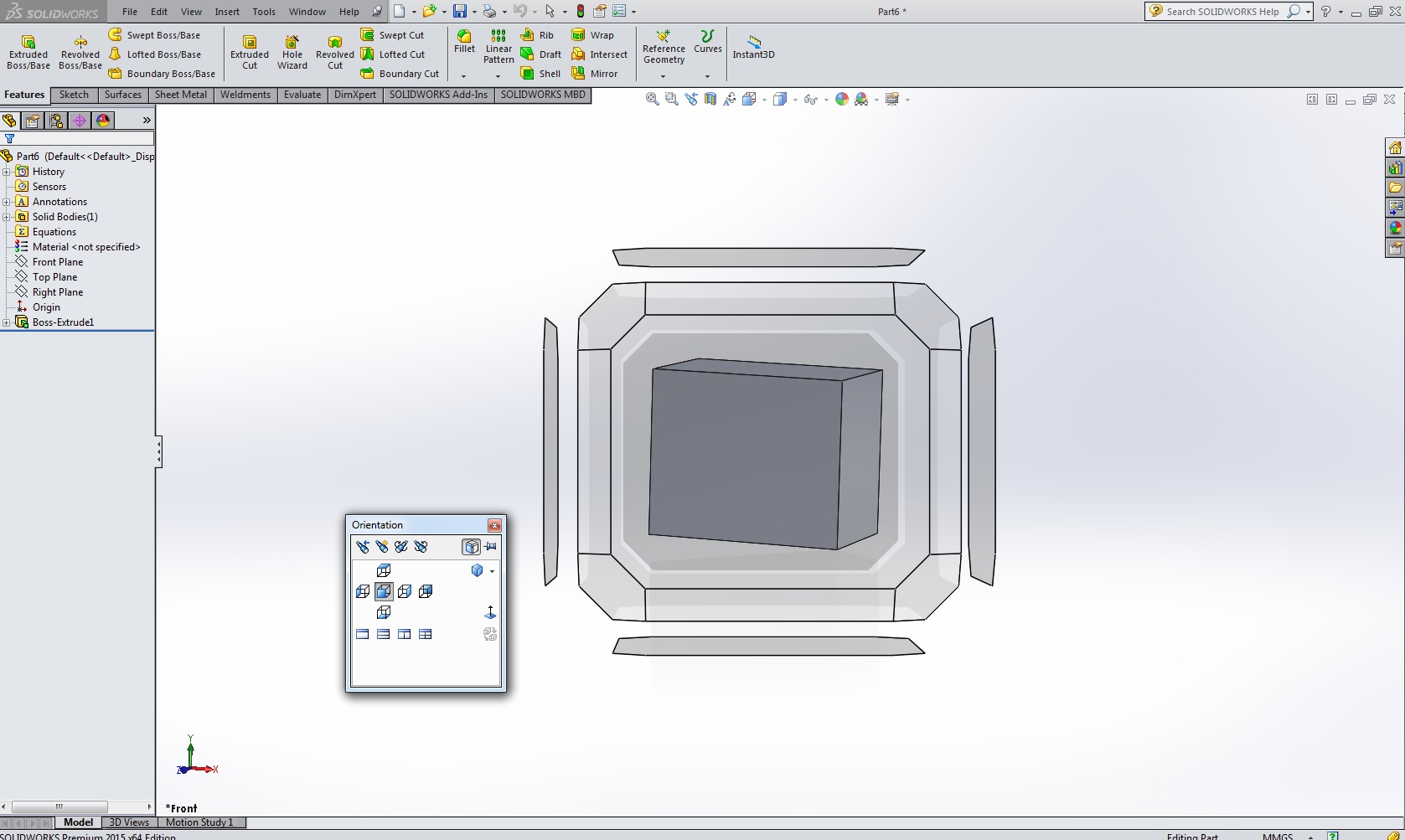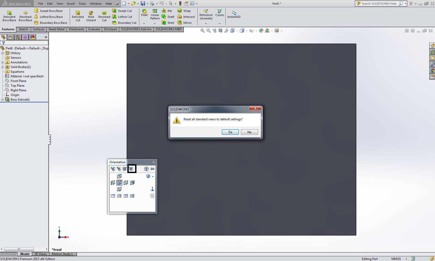 V primeru da izberete Front pogled v SOLIDWORKS model pa ni pravilno obrnjen pomeni, da so orijentacije standardnih pogledov bile spremenjene.