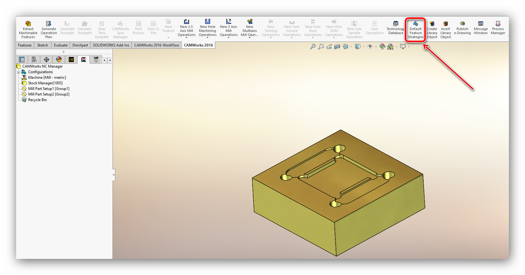 V novi verziji CAMWorks 2016 si lahko ogledate in spreminjanje privzete strategije za strojne obdelave, neposredno v CAMWorks okolju ne da bi dostopali do CAMWorks tehnološke baze podatkov (TechDB) (slika).