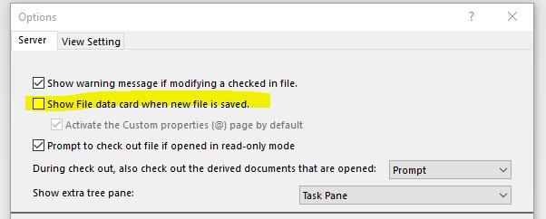 Tools -> SOLIDWORKS PDM -> Options -> nastavitev "Show File Data card when new file is saved"