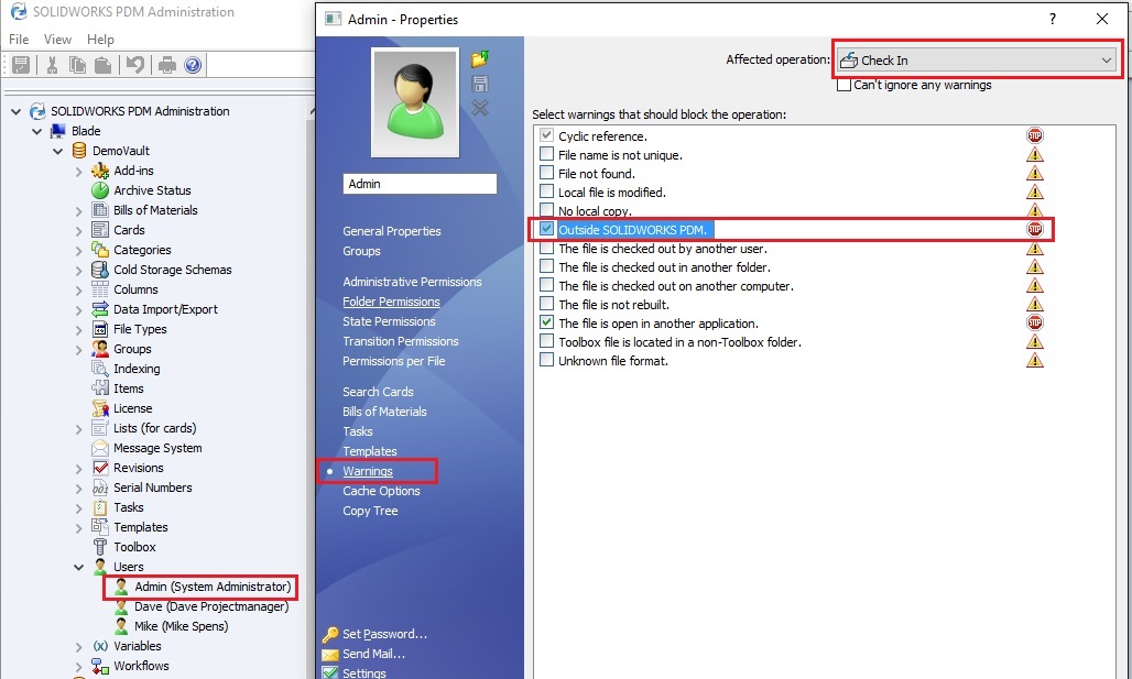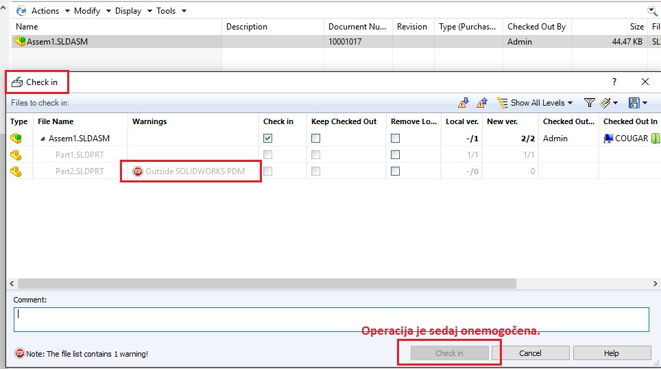 - V polju obkljukamo »Outisde SOLIDWORKS PDM«. Desno se namesto trikotnika s klicajem prikaže ikona stop znaka.