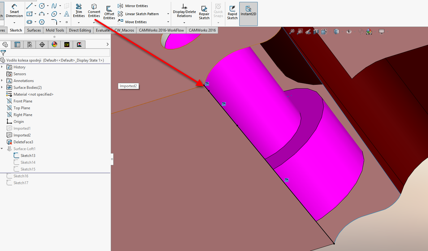 2. Naredimo skico na površinah kjer potrebujemo sklenjene črte, ter s funkcijo "Convert Entities" označimo črte, ki jih potrebujemo.