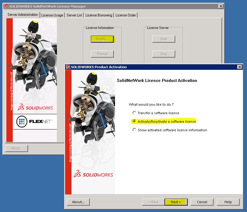 Ob naslednjem zagonu programa SolidNetWork License Manager Server, bo ta javil, da nekatere licence še niso bile aktivirane in jih je potrebno še aktivirati. Tu sledimo postopku opisanem na tej povezavi(razdelek "Strežniški del", koraka 4 in 5)