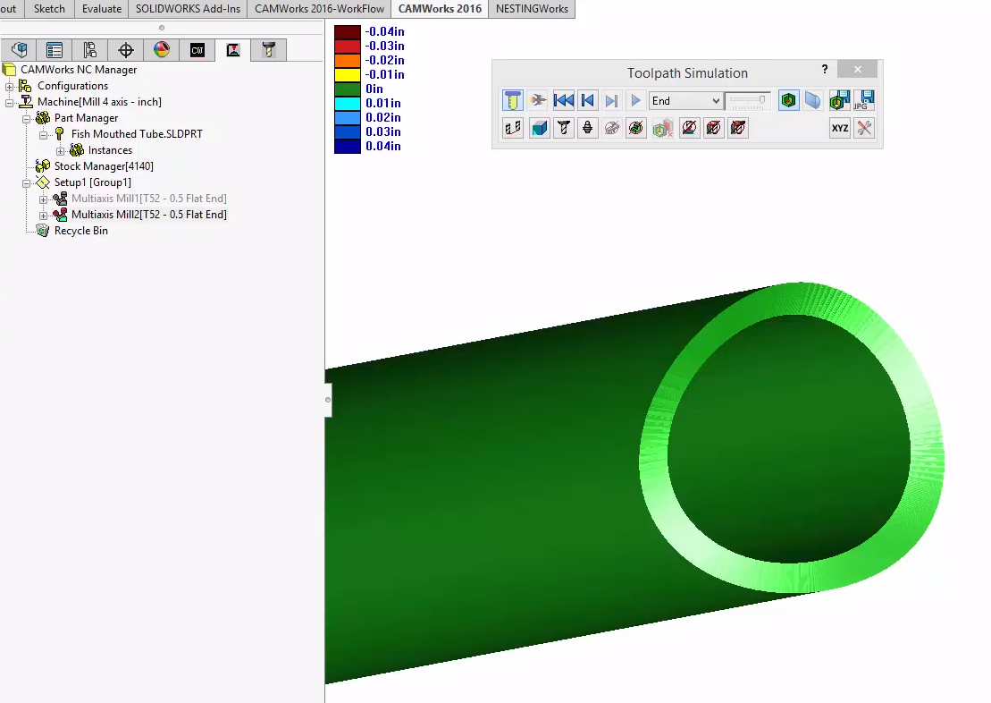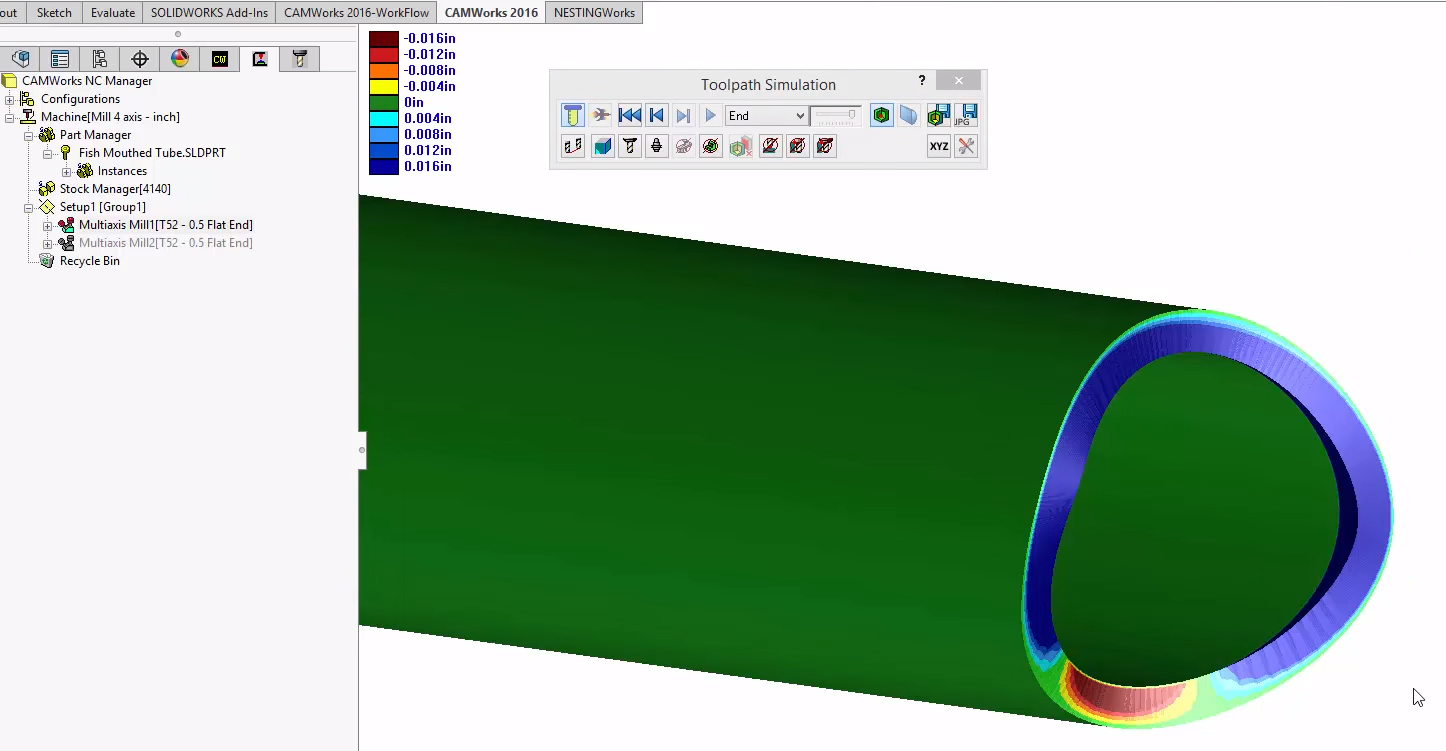 2. Spodnja slika prikazuje 4 osno obdelavo in rezultat rezkanja po 4 osni obdelavi. Barve na modelu, prikazujejo odstopanje od dejanske vrednosti in razlike pri obdelavi.
