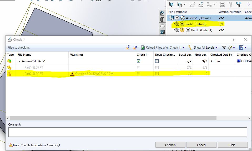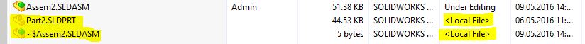 Odpiranje sestava "Assem2.SLDASM" bo še vedno potekalo brez težav, prav tako bo vtičnik v SOLIDWORKSU prikazoval pravilno stanje. »Check-in« dialog pa datoteko »Part2.SLDPRT« še vedno išče in najde na originalni lokaciji znotraj te mape, saj nam je tu v lokalnem pogledu ostala še lokalna kopija te datoteke.