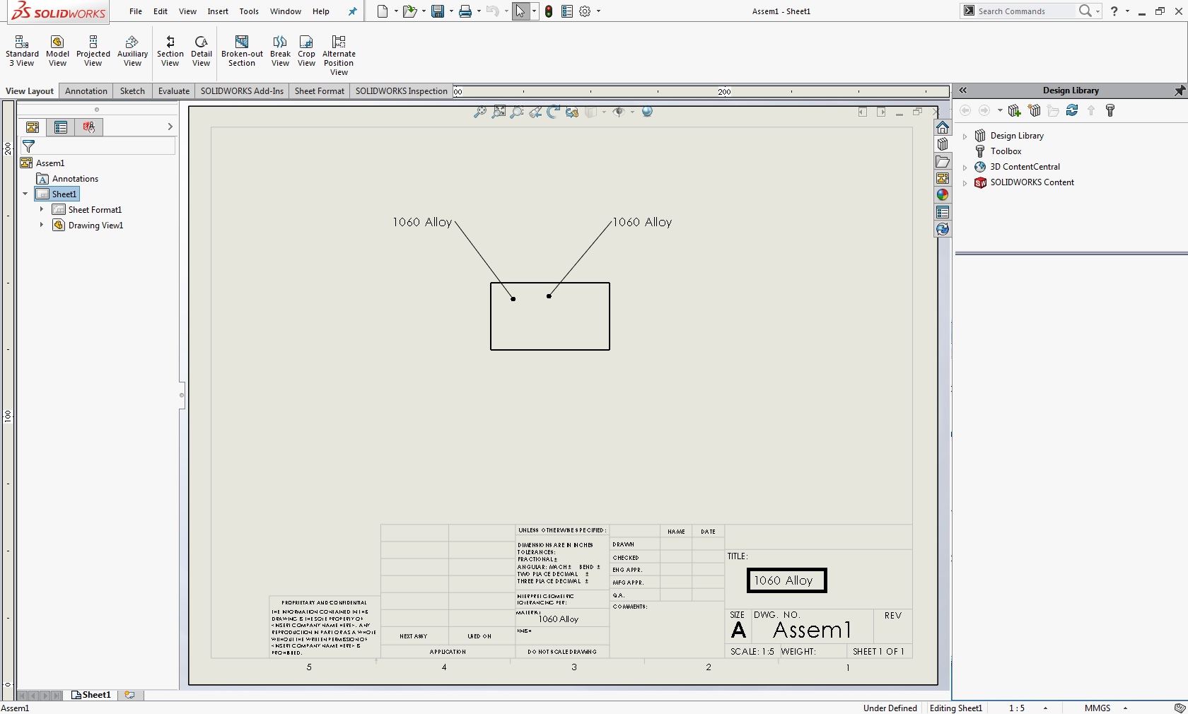 - v sestavu lahko izberemo enega ali več kosov in jim določimo material na nivoju kosa. - izberemo enega od kosov in material kosa izpišemo v Custom Properties sestava. V Custom Properties sestava moramo vpisati pod Value "SW-Material@<ime kosa>.SLDPRT" naprimer "SW-Material@Part1.SLDPRT" za ime parametra pa lahko pustimo "Material" če ga že imamo dodanega na risbi - Ob dodajanju pogledov sestava na risbo se nam izpiše material kateri je dodan na nivoju kosa v glavi risbe