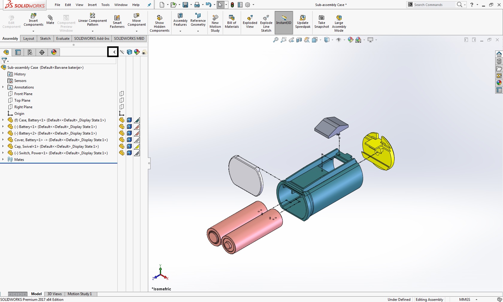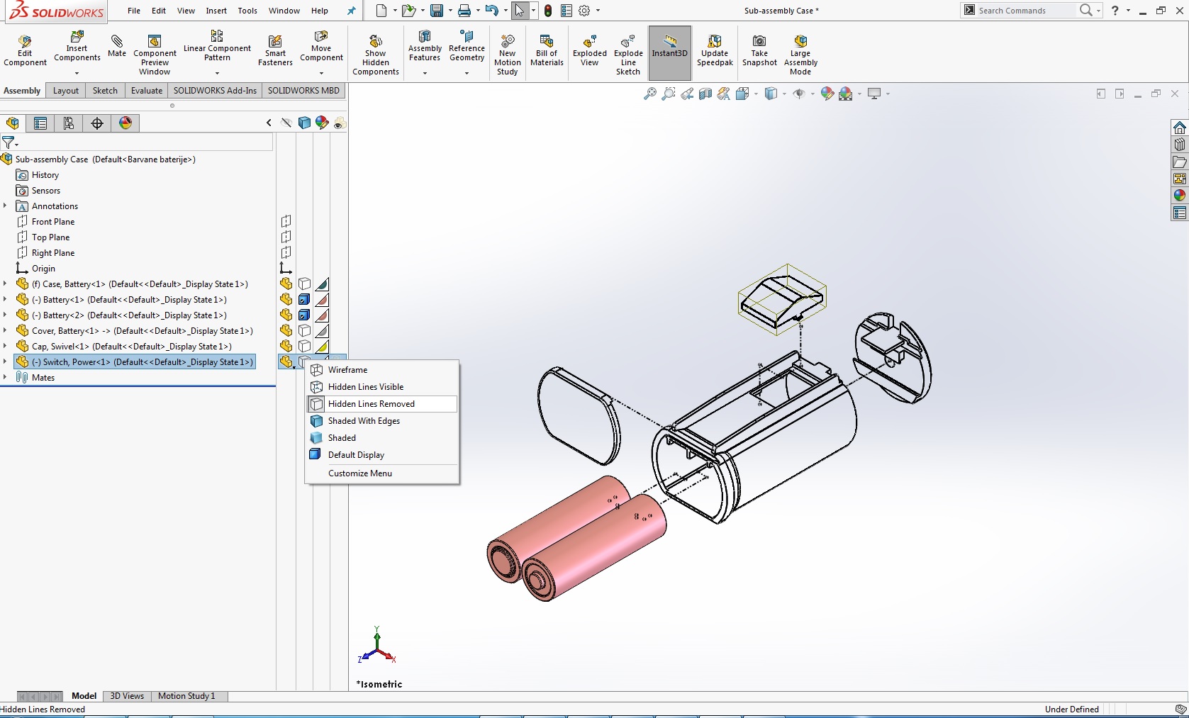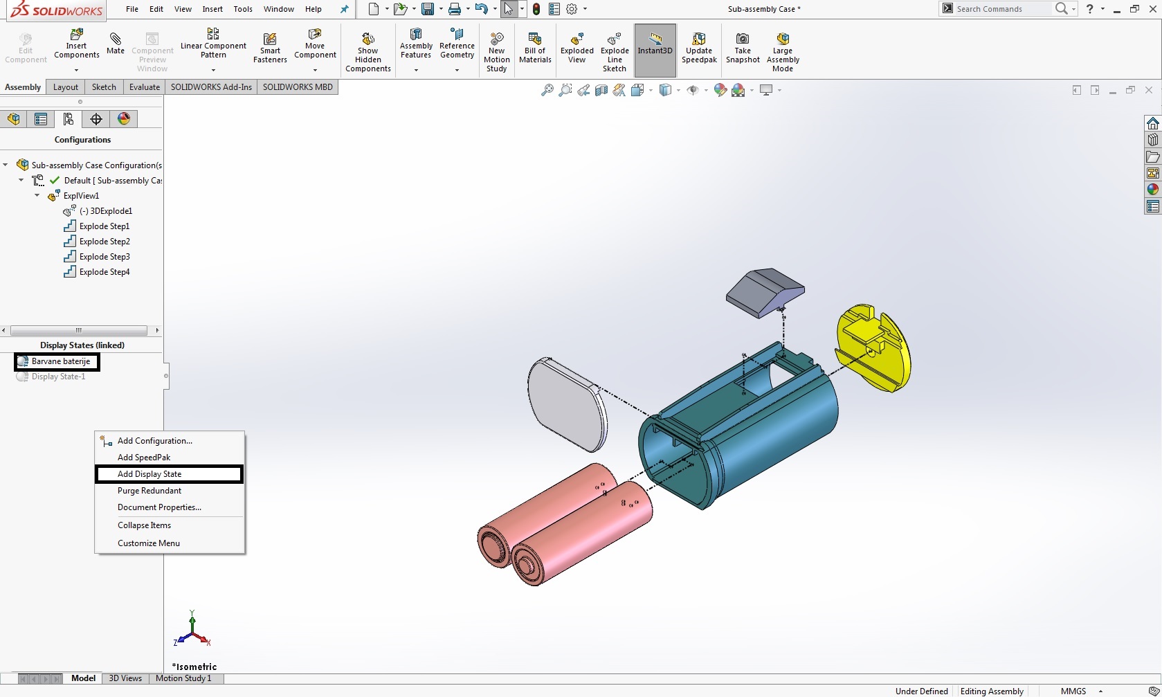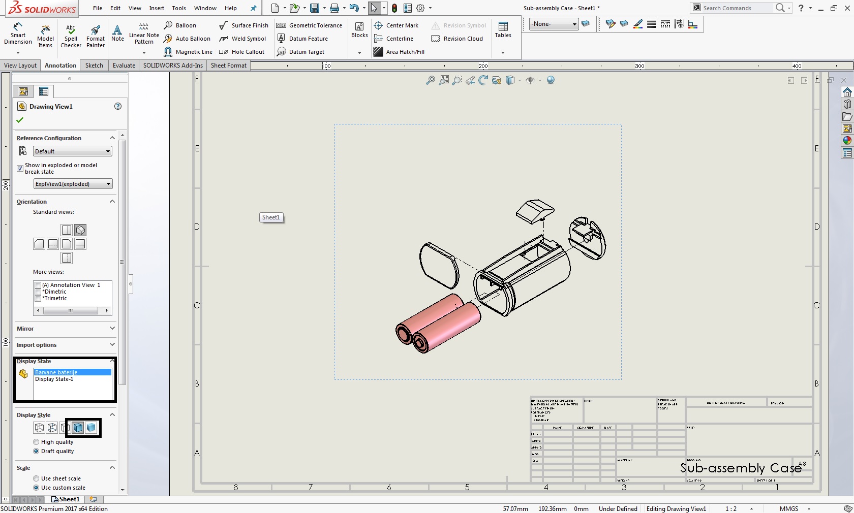 Da dodamo sestav z določenimi obarvanimi kosi na risbo pa je postopek dodajanja isti kot za vse poglede potrebno samo izbrati pravilni Display State v tem primeru je to "Barvane baterije" in pod Display Style moramo imeti izbrano Shaded ali Shaded With Edges.